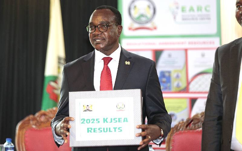 Education CS Julius Ogamba holding the results during the release of the Kenya Junior Schools Education Assessment (KJSEA) 2025 results at the KNEC Headquarters in Nairobi on December 11, 2025[Boniface Okendo, Standard]