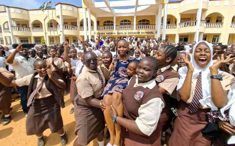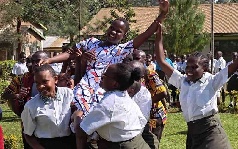 Students and teachers of St Joseph Girls Kakamega celebrate after 30 out of 54 KCSE 2025 candidates got direct university entry. [Mary Imenza, Standard]
