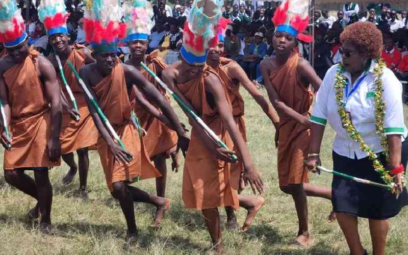 Naivasha MP Jane KIhara joins students from Mirera High School in Naivasha in a gig during a prize giving day. [Antony Gitonga, Standard]