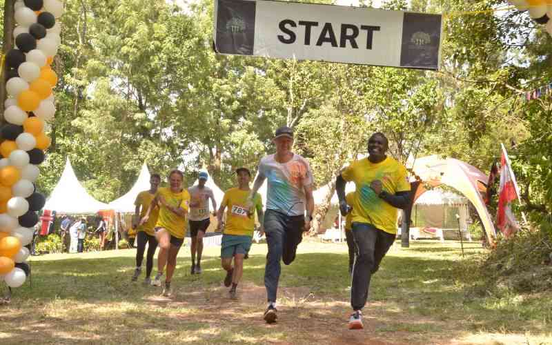 Participants of community trail and colour run at the Brackenhurst indegineous forest in Tigoni Limuru. [George Njunge Standard]