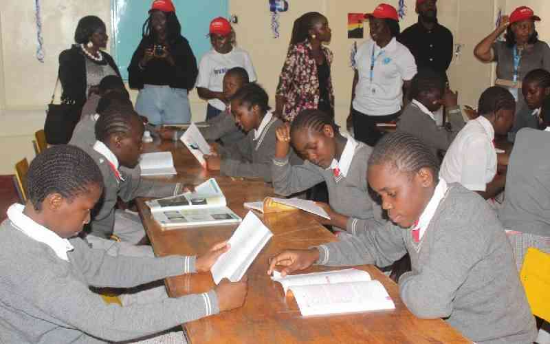 Students enjoying a reading session in the newly opened Kibera community library [Bernard Orwongo,Standard]