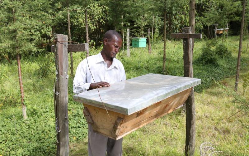 John Kemoi inspecting his bee hive at his farm in Marishoni village, Molo Sub County. [Boniface Thuku, Standard]