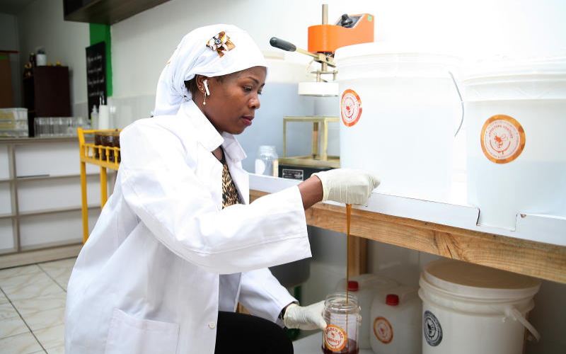 Apiculture Venture Managing Director Pauline Otila Kamwara pours honey on a container for a customer. [Wilberforce Okwiri, Standard]
