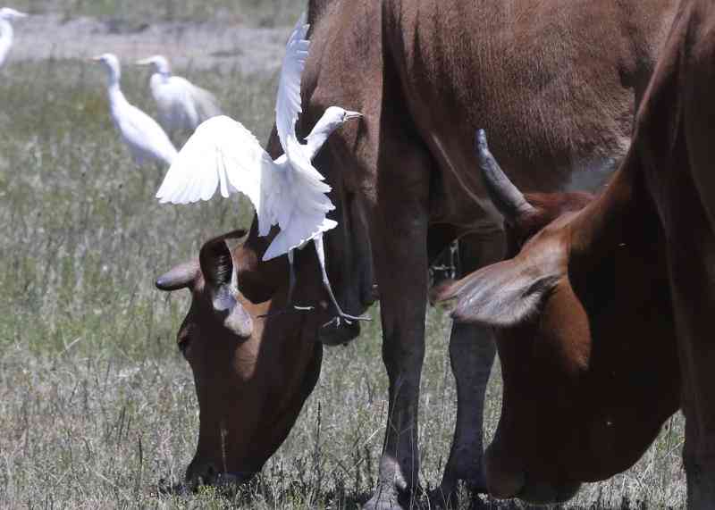 Mutual Relationship; The cattle egret pulls ticks and flies from cattle and consumes them in Kamulu area, on the outskirts of Nairobi City. [Stafford Ondego, Standard]