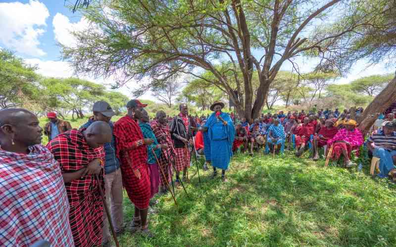 Daniel Leturesh, Chairman of Olgulului Land Trust, engages over 1,000 landowners from the Maasai community during the Special General Meeting in Mashenani, Kajiado County. [Amos Kiarie, Standard]