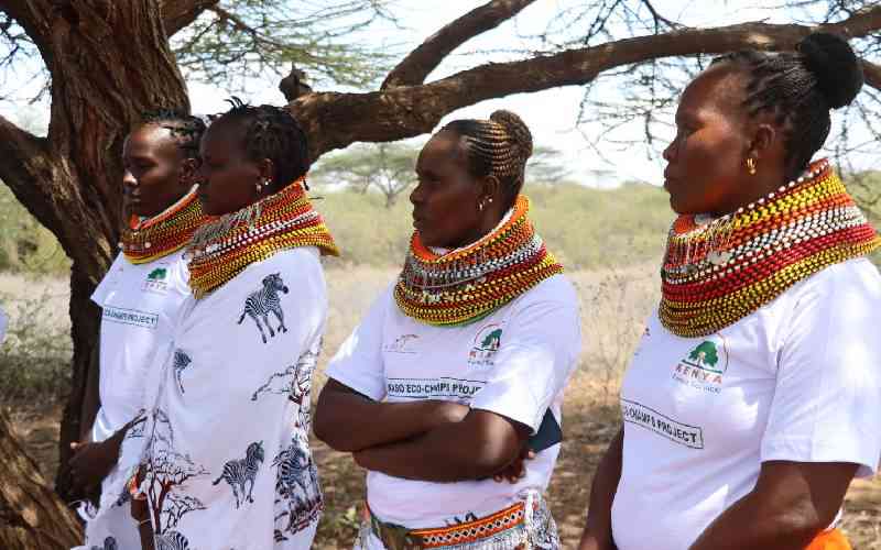 Sabina Namoe (centre) and fellow members of Waso Echo Champions during a forum under an acacia tree on December 10, 2025. [Bruno Mutunga, Standard]