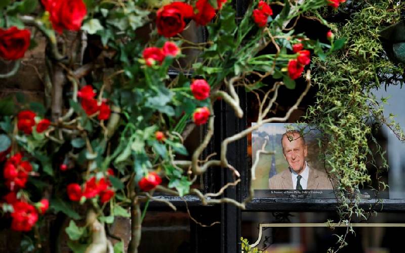 A photo depicts Britain's Prince Philip, husband of Queen Elizabeth, who died at the age of 99, outside a pub in Windsor, near London, Britain, on April 10, 2021. [Reuters]