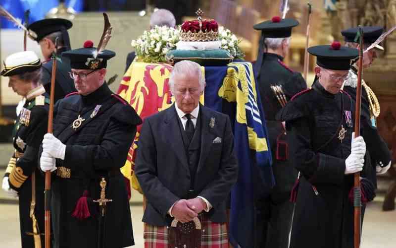Britain's King Charles III, center, and other members of the royal family hold a vigil at the coffin of Queen Elizabeth II at St Giles' Cathedral, Edinburgh, Scotland, September 12, 2022. [AP photo]