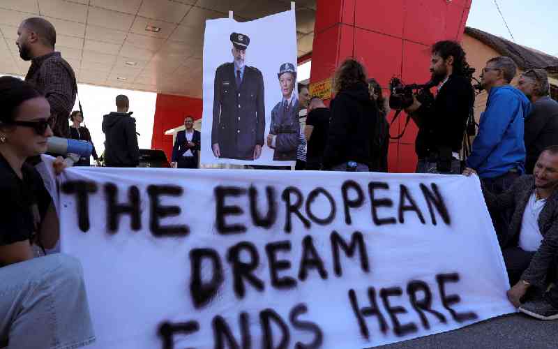 A group of civil rights activists gather in protest, after the first group migrants intercepted in Italian waters, arrived at Shengjin port in Albania on October 16, 2024. [AFP]