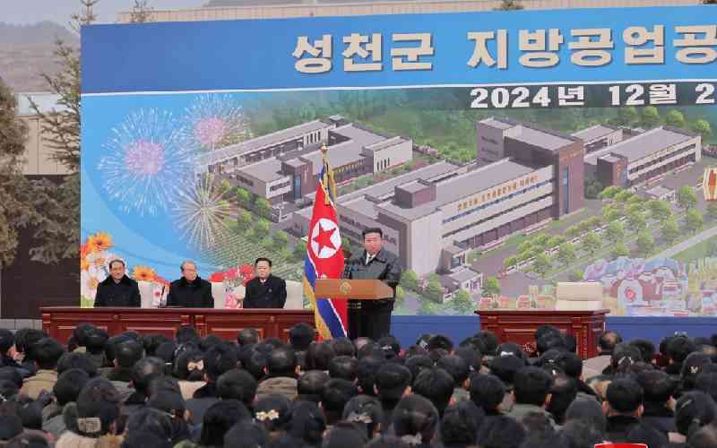North Korean leader Kim Jong Un making a speech on the inauguration ceremony of the regional-industry factory in Songchon County. on Dec 21, 2024. [AFP]