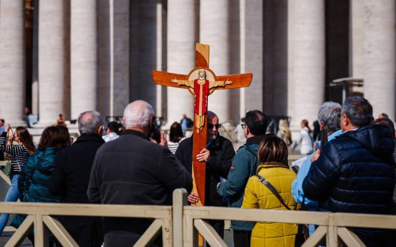 Pilgrims walk with a wooden cross at St Peter's square in The Vatican as Pope Francis is still hospitalized with pneumonia and will not lead the Angelus prayer on March 02, 2025.[Photo, AFP]
