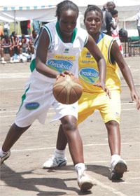Michelle Auma of Buruburu School (left) evades Tigoi Girls’ Leah Atieno’s tackle in a basketball preliminaries match at Upper Hill School, Thursday. [PHOTOS: MARTIN MUKANGU/STANDARD]