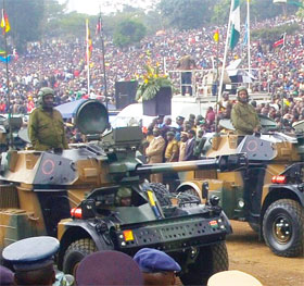 Kenya Army soldiers (above) drive past the dias in a spectacular show of force [Photos: Andrew Kilonzi/Standard]