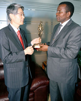 The Standard Group Deputy Chairman and Chief Executive Paul Melly presents a gift to Ambassador Chan-Woo KIM of Korea who is also the Permanent Repres