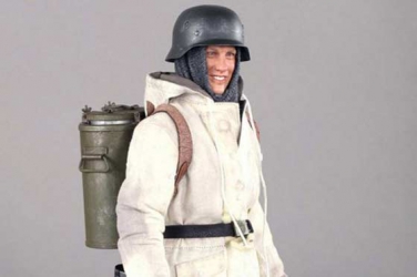 The toy soldiers are dressed as Wehrmacht veterans, including a swastika-bearing eagle on their uniform.