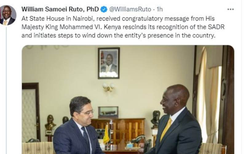 "Kenya rescinds its recognition of the SADR and initiates steps to wind down the entity's presence in the country," Ruto's tweet read in part.