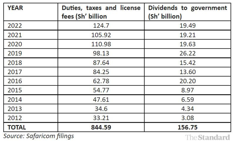 Here are the duties, taxes and license fees paid by Safaricom as well as dividends given to the government in the last 11 financial years.