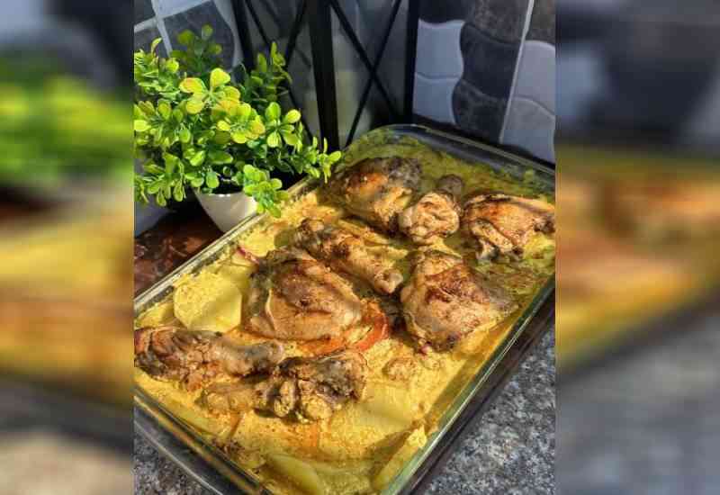 Arrange the chicken thighs and drumsticks on top of the potatoes and return the casserole to the oven for 15 minutes to get that extra crust on top.