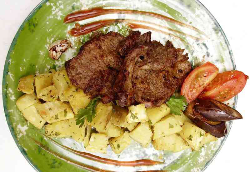In a hot non stick pan, put some oil, add two whole cloves of garlic and place the marinated steaks (sealing the pores on both sides plus the fat side so that the fat layer gets golden brown.