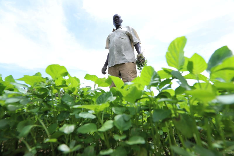 Stephen Omoding' at his vegetable farm in Muhoroni, Kisumu County.