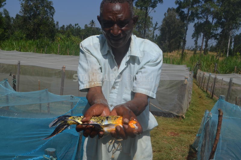 Samuel Karunditu a fish breeder shows off an ornamental brooder at his farm near Sagana town,Kirinyaga County where he specialises in breeding and selling of both ornamental and cat fish fingerlings. [Munene Kamau/Standard]