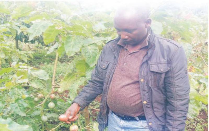 Joseph Wanderi Njuguna, popularly known as Mawiko, checks the condition of his tree tomato fruits in his farm in Kabazi, Nakuru County. [Willies Mwaniki]
