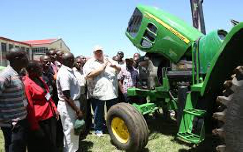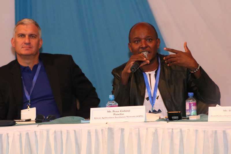 Peter Githinji (left), a panellist from Africa Agribusiness Incubators Network, with Michael Wallis-Brown, the Baib OY CEO during the Agro-2019 conference at the University of Nairobi’s Kabete Campus.