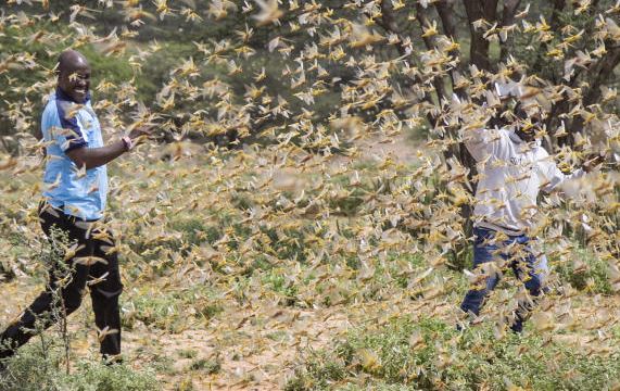 Men who work for a county disaster team wrestle with locusts, near the village of Sissia, Samburu. [AP Photo/Patrick Ngugi]