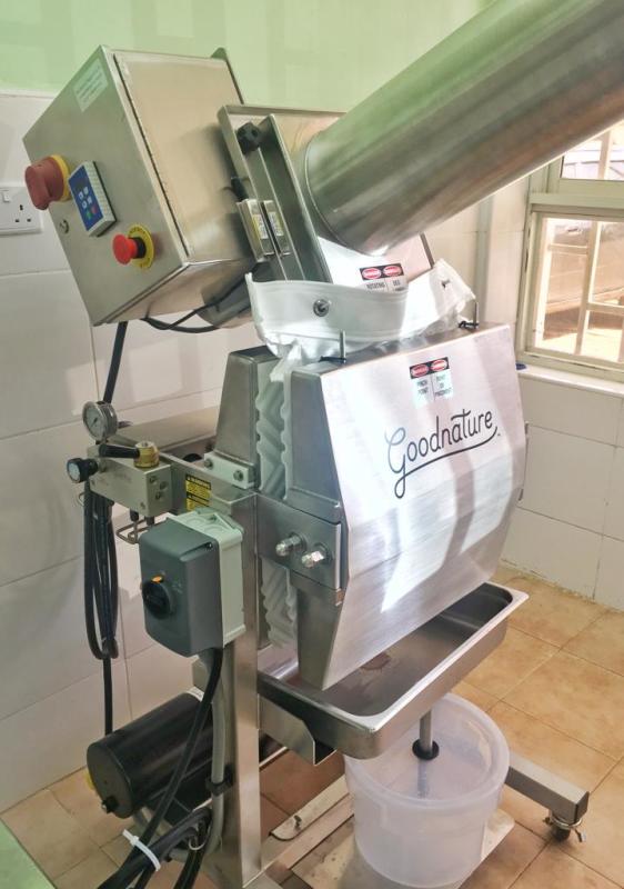 Once in the bag, the shredded produce is exposed to a hydraulic press where two plates, like a nice massage, gently but firmly, exert 40 tonnes of pressure on the produce. The pressure squeezes the juice and water content from the produce causing it to drip into a collection tray called a gastronorm below, leaving behind dry fibre content in the filter bag. “It is a very efficient way of juicing,” Tsholo admits. The fibre left behind is generally composted, recycled in food products or discarded. In Tsholo’s case, they give it to Taka Taka solution who compost it to fertiliser. Previously, they gave the fibre to a pig rearing farmer. The pressed juiced is then packaged and refrigerated.