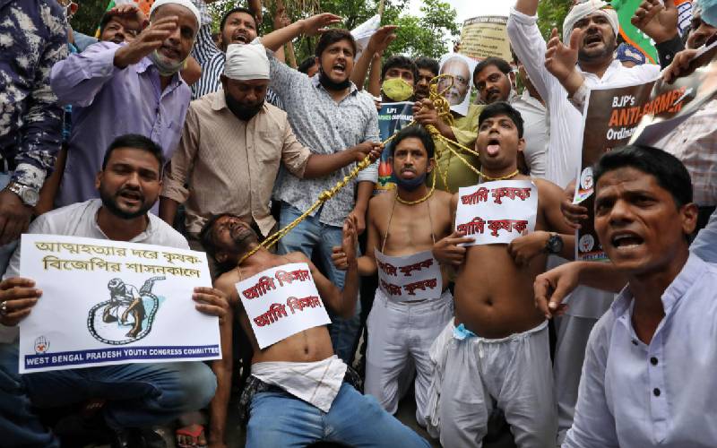 Supporters of India's main opposition Congress party shout slogans during a protest against farm bills passed by India's Parliament in Kolkata on September 21, 2020. [Reuters]