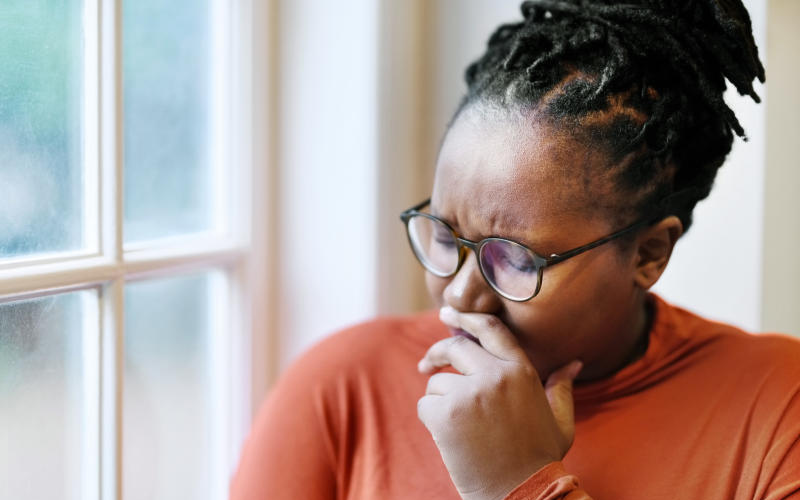 Close-up of a sad afro american woman crying while sitting by a window at home [Getty Images]