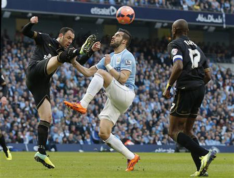 | Wigan Athletic's Ivan Ramis (L) challenges Manchester City's Alvaro Negredo (C) during their English FA Cup quarter final soccer match at the Etihad stadium in Manchester, northern England March 9 |