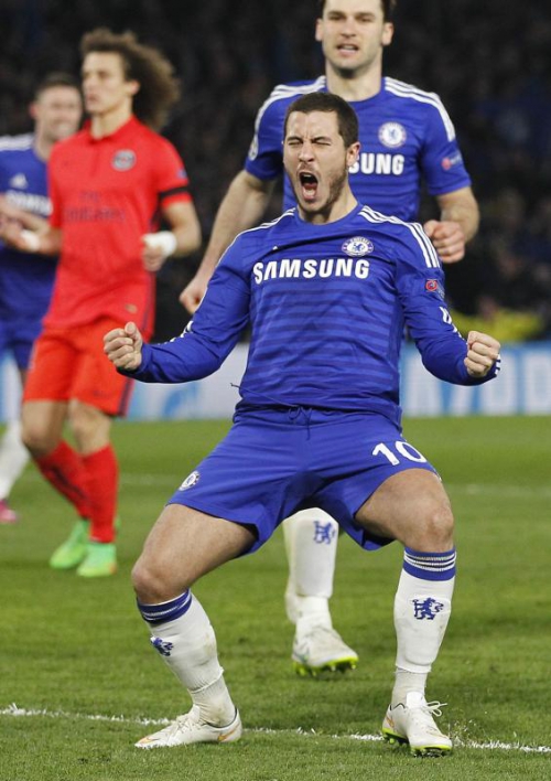 Chelsea's Belgian midfielder Eden Hazard celebrates after scoring his team's second goal during the UEFA Champions League round of 16 second leg football match between Chelsea and Paris Saint-Germain at Stamford Bridge in London on March 11, 2015. AFP PHOTO / IAN KINGTON