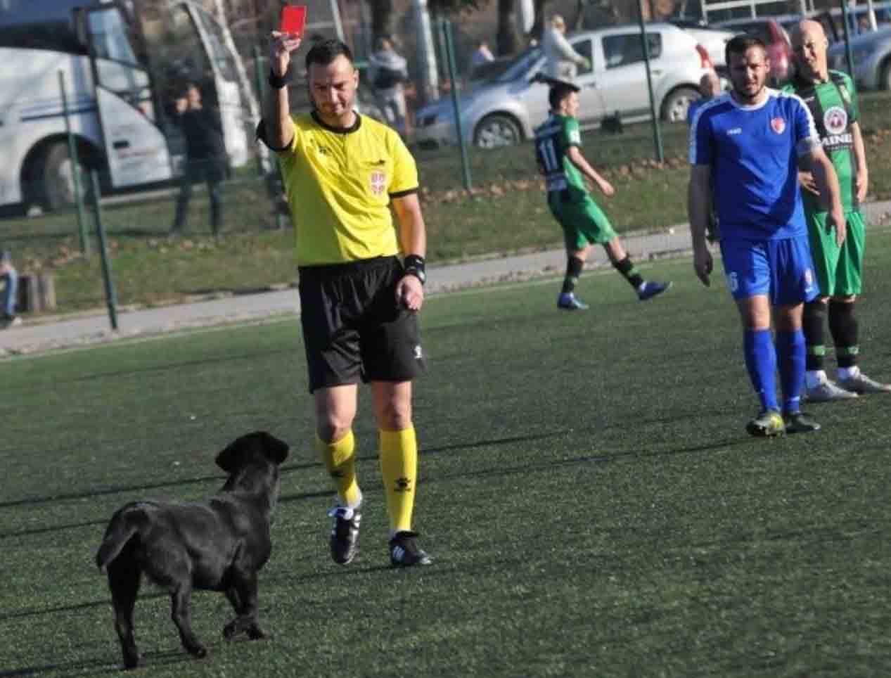 Belgrade daily Sportski Zurnal published a photograph on its website of referee Marko Ivkovic flashing a red card to the dog who had chased the ball relentlessly every time it ran onto the pitch before it finally scampered off.