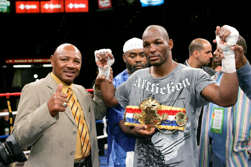 FILE PHOTO: Boxer Marvelous Marvin Hagler poses with Bernard Hopkins, of Philadelphia, following their light heavyweight fight at the Mandalay Bay Events Center in Las Vegas [Reuters]