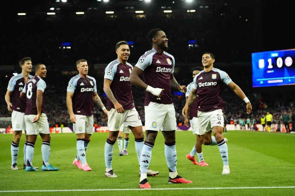 Jhon Duran centre-forward of Aston Villa celebrates with teammates after scoring his sides first goal during the UEFA Champions League match against Bayern Munich. [AFP]