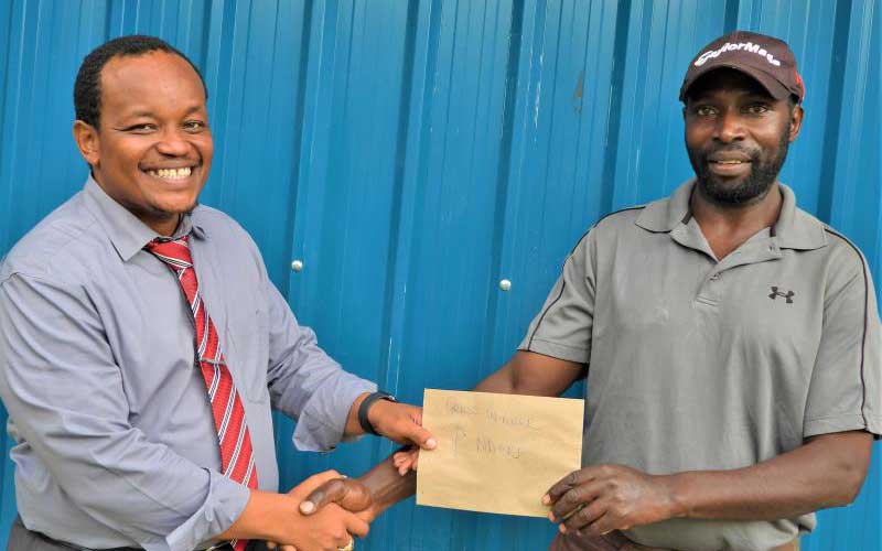Nyeri Town Mp Ngunjiri Wambugu (left) presents a voucher to Peter Nderi (right), the winner of Ngunjiri Wambugu Caddies tournament played at Nyeri Golf Club, March 4, 2020. [Mose Sammy]