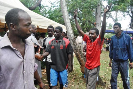 Some of the 16 youths addicted to drugs surrender to the government during a public meeting at Likoni in Mombasa County on Wednesday 9th September 2015. Mombasa County Commissioner Nelson Marwa warned the officers collaborating with drug barons and directed the area DCIO to ensure all drug barons are arrested and charged in court. Photo/Kelvin Karani