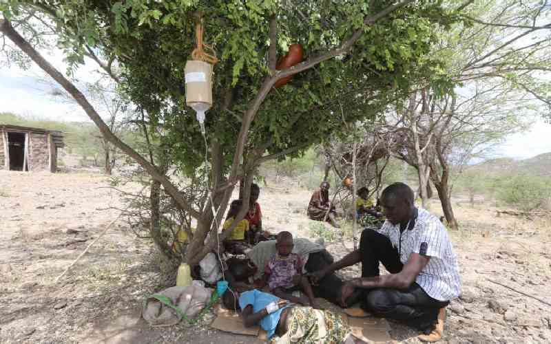Reuben Rotich a volunteer community health worker attending to Malaria patients under a makeshift dispensary at Chesawach village in Tiaty, Baringo County. [Joseph Kpsang, Standard]