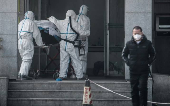 Medical workers carry a patient into a hospital for patients infected with the new coronavirus strain in Wuhan, China. [AFP]