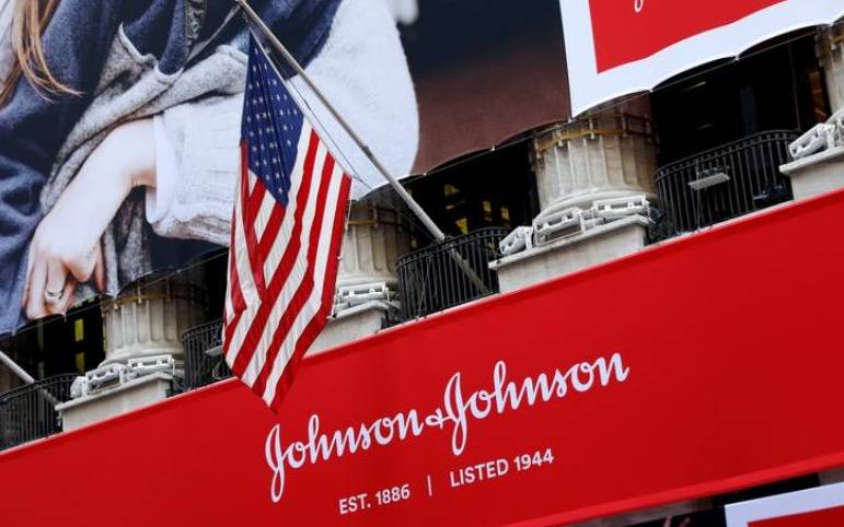 FILE PHOTO: The U.S. flag is seen over the company logo for Johnson & Johnson to celebrate the 75th anniversary of the company's listing at the New York Stock Exchange (NYSE) in New York, U.S., September 17, 2019. REUTERS/Brendan McDermid/File Photo