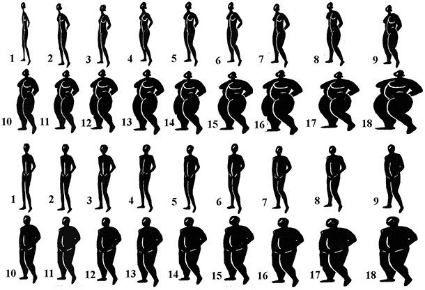 Body image rating scale for men and women. Images 1 through 5 represent people who are underweight, images 6 through 9 represent people of normal weight, images 10 through 13 represent overweight people, and images 14 through 18 represent obese people. [PHOTO: COURTESY: PUBMED]