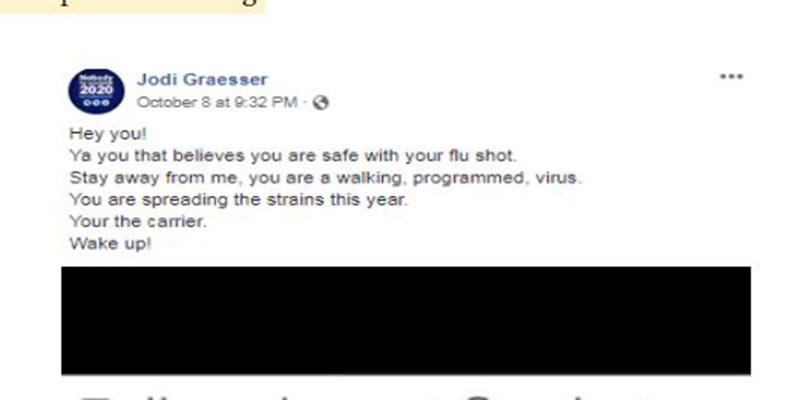 A screengrab of plain text explaining that flu shots turn people into “an active live walking virus” was shared at least one thousand times in the past week. One Facebook user added the caption: “Your the carrier. Wake up!” as a warning.