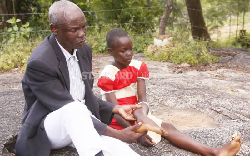 Abel Akiror shows his daughter Vivian Asere's affected leg.