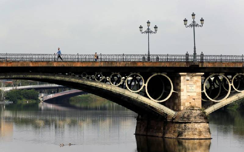 People walk along Triana bridge during the coronavirus disease (Covid-19) outbreak, in the Andalusian capital of Seville, Spain, April 10, 2020. [Reuters]