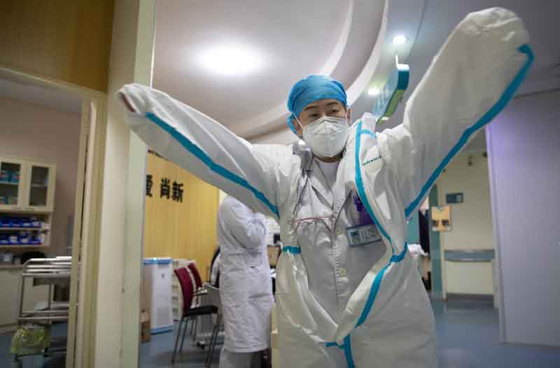Zhang Jixian, director of the respiratory and critical care medicine department of Hubei Provincial Hospital of Integrated Chinese and Western Medicine, puts on the protective suit before entering the ward at the hospital in Wuhan, central China's Hubei Province, March 11, 2020. [Ke Hao/Xinhua]