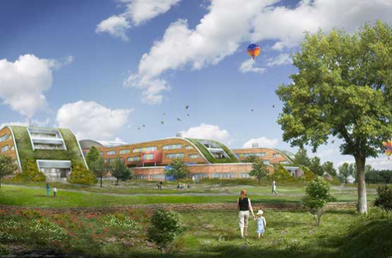 A grass and wildflower roof slopes into a parkland, surrounding the new campus with nature. In the main reception hall there is one of the world's biggest tree houses.