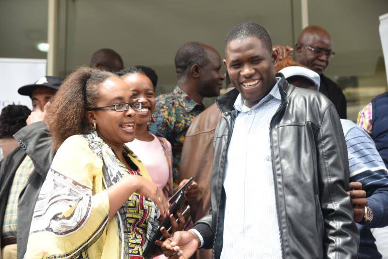 Kenya Medical Association President Dr.Jacqueline Ktulu (Left) converse with Kenya Medical Practitioners and Dentist Union Secretary General Dr.Ouma Olunga (Right) after press conferences on 5th January 2018 at Kenya Medical Association(KMA),They support Universal Health Coverage(UHC). [Photo: Edward Kiplimo/Standard]