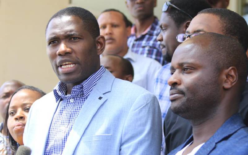 Kenya Medical Practitioners, Pharmacists and Dentists' Union Secretary-General Ouma Oluga (Centre) and KMPDU Chairman Dr Samuel Oroko (Right). [Wilberforce Okwiri, Standard]