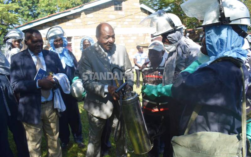 Homa Bay Health executive (in brown suit) holds an-anti malarial drug spraying machine at the county offices on February 10, 2020. [James Omoro]